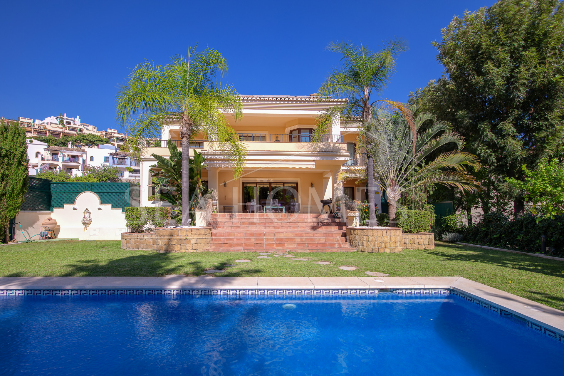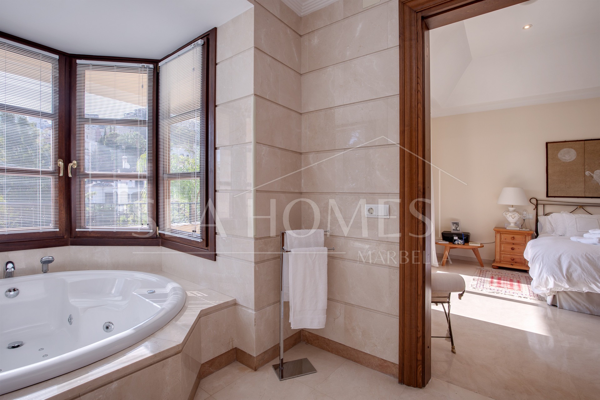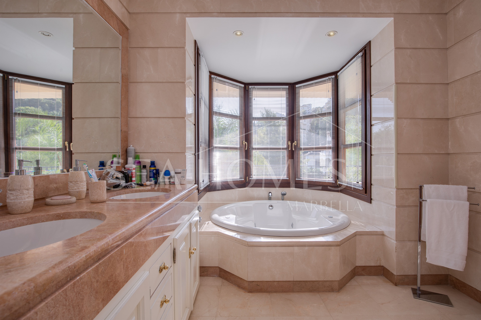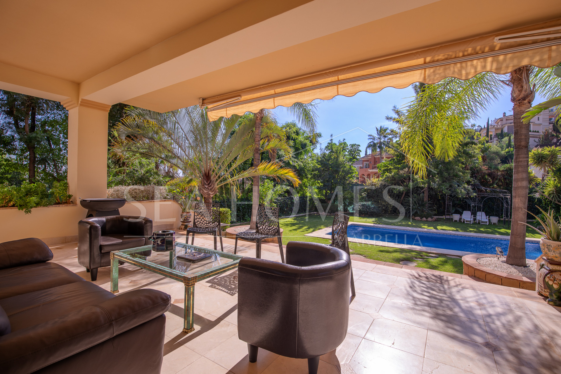 This marvelous villa is located in Los Arqueros urbanization, with 24/7 security. It’s situated between La Quinta, El Madronal, La Zagaleta, and San Pedro Alcántara. In close proximity to the best golf courses in Marbella and Benahavis, the area offers excellent services, restaurants, various international schools, and easy access to the highway.
