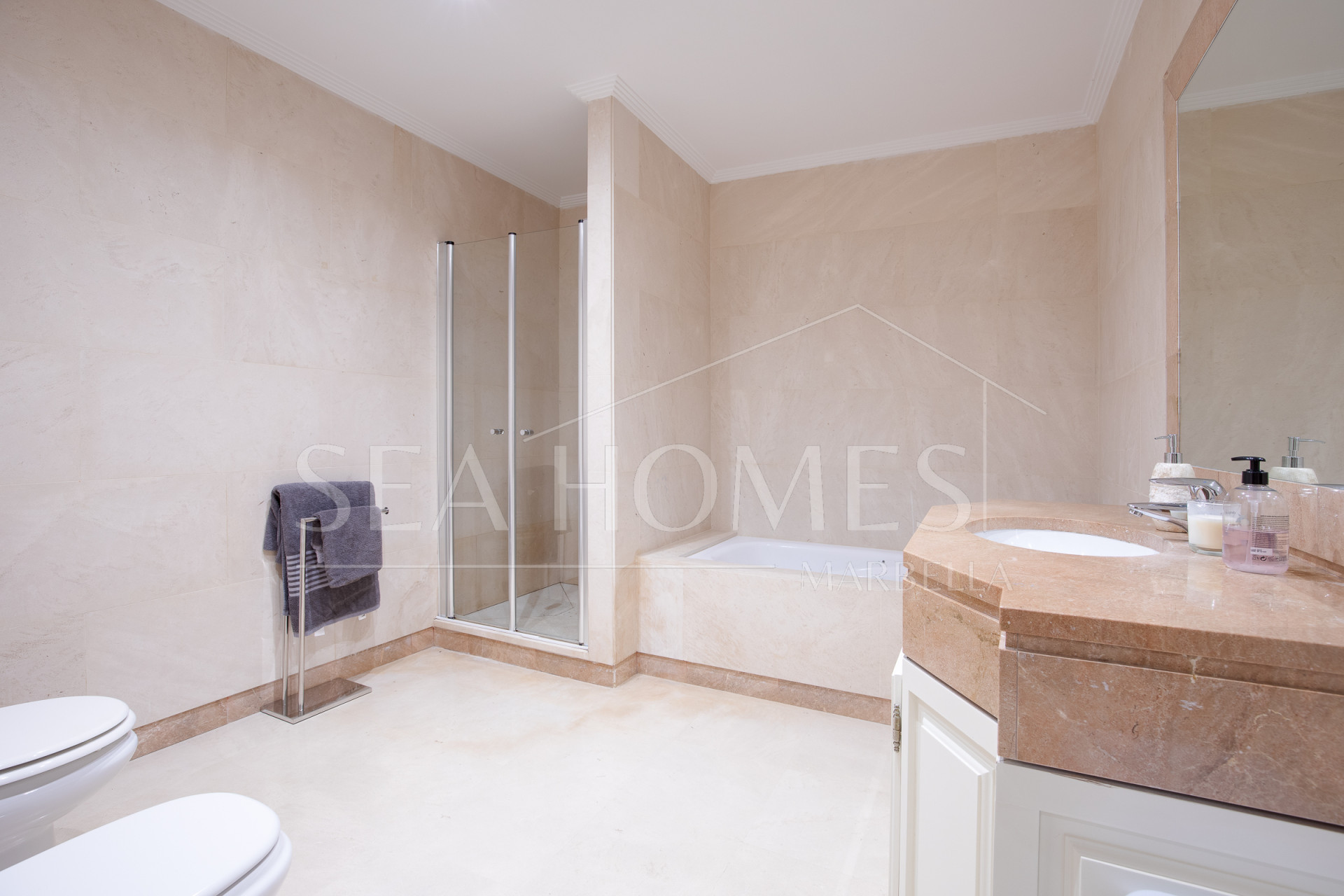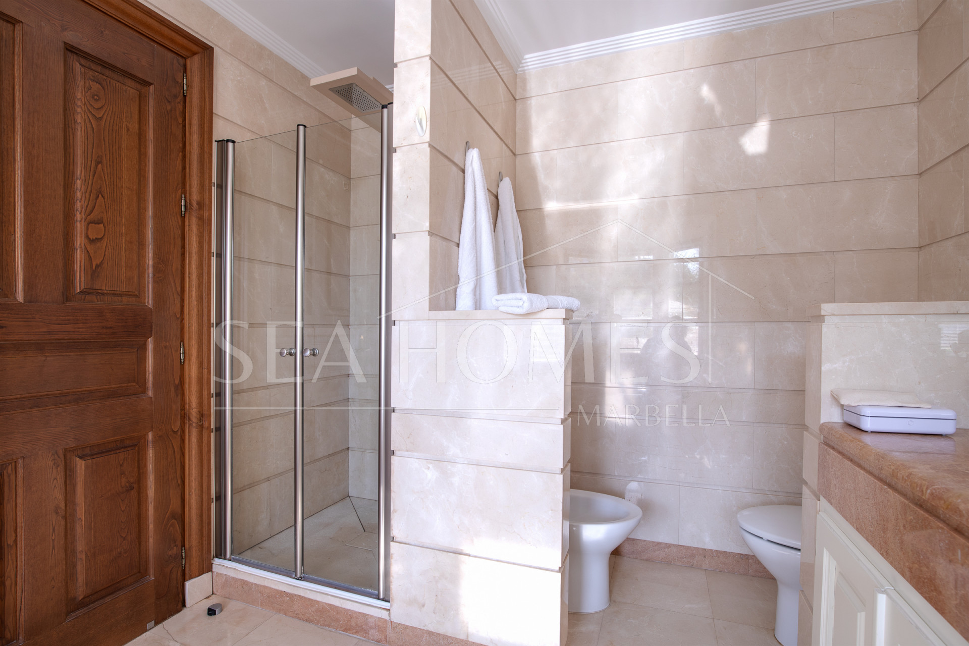 The property stands out for its timeless qualities, thanks to the use of noble materials in its construction. It features highly efficient AC and heating technologies, with underfloor heating throughout the house based on aerothermal systems and solar panels. The rooms are very spacious, each with an ensuite bathroom, and the garage can easily accommodate 4 cars, with an existing electric car charging installation.