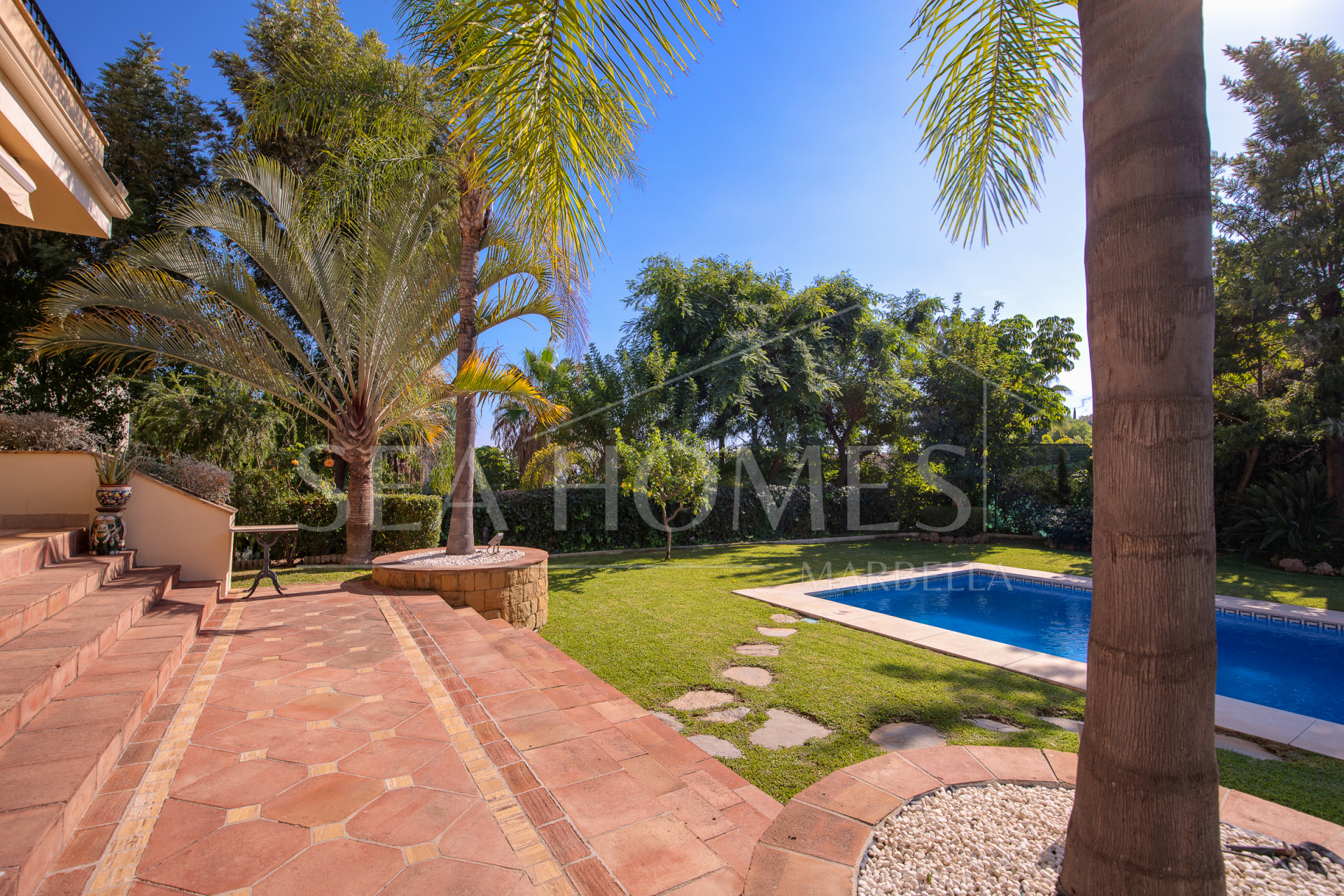 The mature garden provides an oasis of tranquility around a spacious pool and seating area. Everything is just ready to create your new home.